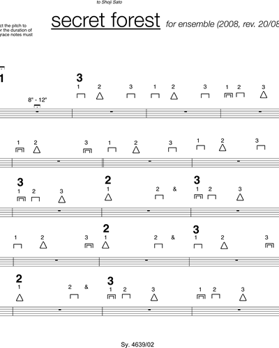 Fujikura, Dai: Secret Forest (2008 (revised Aug. 2009)) vegyes kamarazene-kotta (alt) klarinétre, angolkürtre, nagybőgőre, harántfuvolára, énekhangra, oboára, orgonára, ütőhangszerre és zongorára